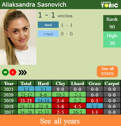 Sasnovich has a 1-1 win-loss record in 2021, 1-1 on hard (See FULL STATS).