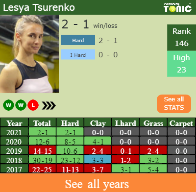 Tsurenko has a 2-1 win-loss record in 2021, 2-1 on hard (See FULL STATS).