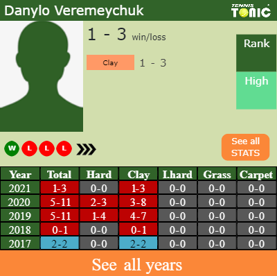 Danylo has a 1-3 win-loss record in 2021, 1-3 on clay (See FULL STATS).