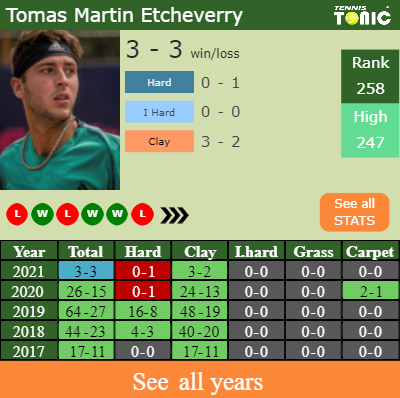 Martin has a 3-3 win-loss record in 2021, 3-2 on clay (See FULL STATS).