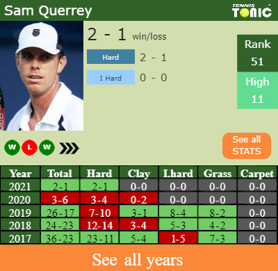 Querrey has a 2-1 win-loss record in 2021, 2-1 on hard (See FULL STATS).