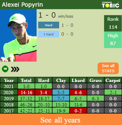 Alexei has a 1-0 win-loss record in 2021, 1-0 on hard (See FULL STATS).