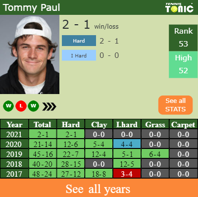 Paul has a solid record in the last 7 years having won 65% of his matches (234-127). 2-1 on hard in 2021. Talking about his performance on the same surface of this tournament, Paul has a 115-65 win-loss record in the last 7 years on hard.