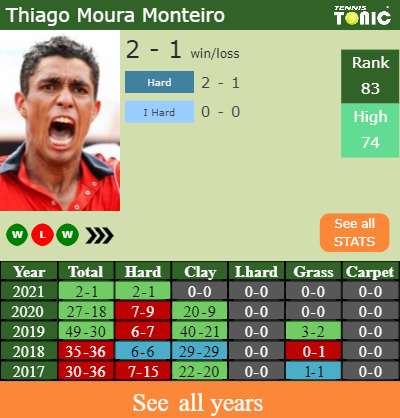 Moura Monteiro has a favorable record in the last 10 years having won 59% of his matches (348-239). 2-1 on hard in 2021. In connection with his performance on the same surface of this event, Moura Monteiro has a 55-55 match record in the last years on hard.