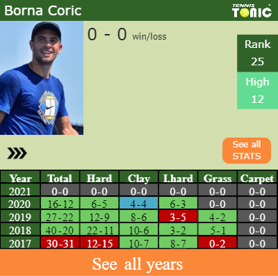 Talking about his overall career, Borna has an overall 277-184 record. He has a positive 135-79 record on hard.