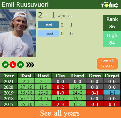 The Finn has a 2-1 win-loss record in 2021, 2-1 on hard (See FULL STATS).
