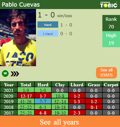 Cuevas has a good win-loss record in the last 10 years having won 59% of his matches (232-160). 1-0 on hard in 2021. Talking about his performance on the same surface of this tournament, Cuevas has a 33-50 record in the last years on hard.