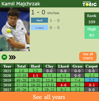 Majchrzak has a solid record in the last 9 years having won 63% of his matches (278-165). 1-0 on hard in 2021. In connection with his performance on the same surface of this competition, Majchrzak has a 50-32 record in the last 9 years on hard.