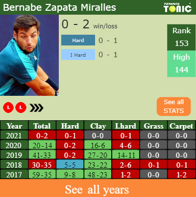 In terms of his career, Bernabe has an overall 238-172 record. He has a negative 22-29 record on indoor hard courts.