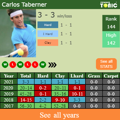 Taberner has a solid match record in the last 7 years having won 66% of his matches (264-138). 1-1 on clay in 2021. Regarding his performance on the same surface of this event, Taberner has a 232-109 win-loss record in the last 7 years on clay.