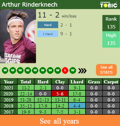 Rinderknech has a solid match record in the last 6 years having won 68% of his matches (147-70). 9-1 on indoor hard courts in 2021. Talking about his performance on the same surface of this event, Rinderknech has a 42-19 match record in the last 6 years on indoor hard courts.