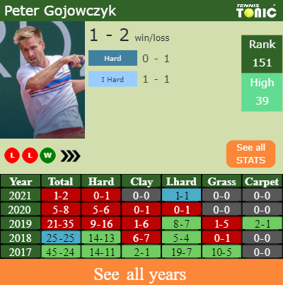 Gojowczyk has a 1-2 win-loss record in 2021, 1-1 on indoor hard courts (See FULL STATS).