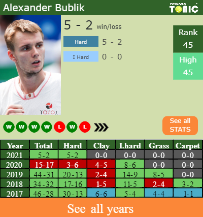 Bublik has a 5-2 win-loss record in 2021, 5-2 on hard (See FULL STATS).