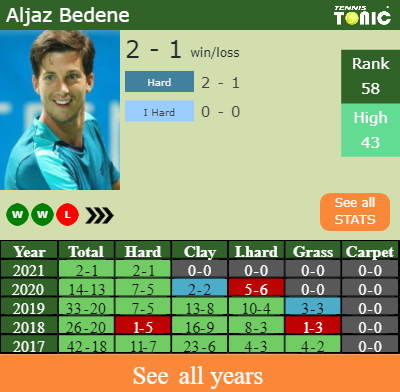 Bedene has a 2-1 win-loss record in 2021, 2-1 on hard (See FULL STATS).