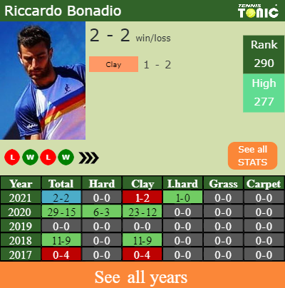 Bonadio has a winning match record in the last 7 years having won 59% of his matches (57-40). 1-0 on indoor hard courts in 2021. Regarding his performance on the same surface of this event, Bonadio has a 1-0 match record in the last 7 years on indoor hard courts.