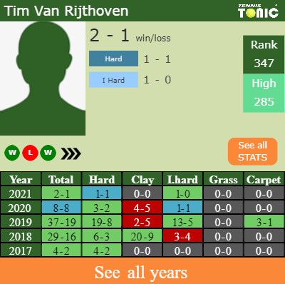 Van Rijthoven has a 2-1 win-loss record in 2021, 1-0 on indoor hard courts (See FULL STATS).