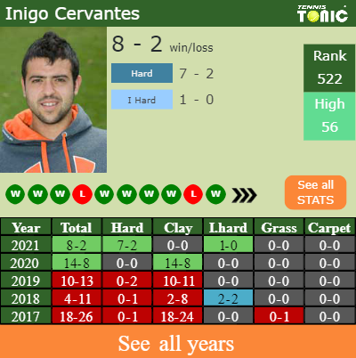 Cervantes has a 8-2 win-loss record in 2021, 1-0 on indoor hard courts (See FULL STATS).