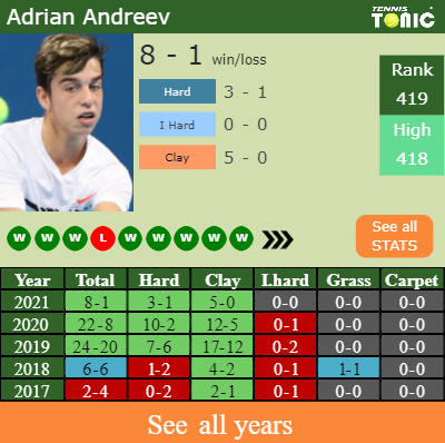 Andreev has a 8-1 win-loss record in 2021, 0-0 on indoor hard courts (See FULL STATS).