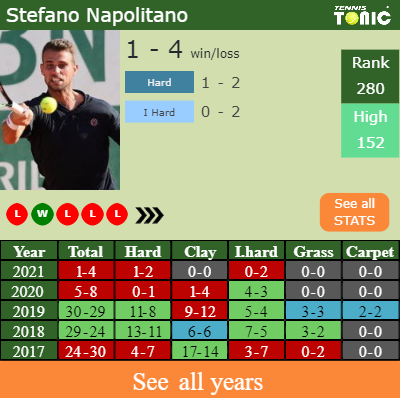 In terms of his career, Napolitano has an overall 238-209 record. He has a positive 52-43 record on indoor hard courts.