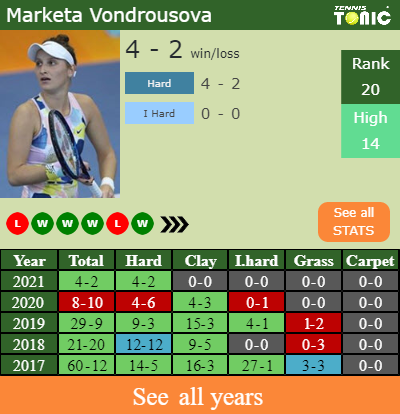 Vondrousova has a 4-2 win-loss record in 2021, 4-2 on hard (See FULL STATS).