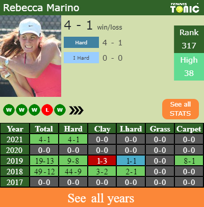 Both Vondrousova and Marino played 1 match. At the moment, Marketa Vondrousova lost 1 set while Rebecca Marino hasn’t surrendered a set so far. Vondrousova has played 1 set more than Marino (3 vs 2). Therefore, Vondrousova played 13 games more than Marino. Vondrousova scored 39 winners (37% of the total points). On the other side, The Canadian struck 30 winners (38%).
