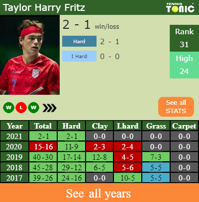 Fritz has a solid win-loss record in the last 8 years having won 61% of his matches (245-157). 2-1 on hard in 2021. Talking about his performance on the same surface of this competition, Fritz has a 147-82 match record in the last 8 years on hard.