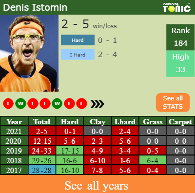 Istomin has a 2-5 win-loss record in 2021, 2-4 on indoor hard courts (See FULL STATS).