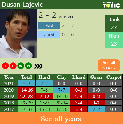 Lajovic has a favorable win-loss record in the last 10 years having won 54% of his matches (300-255). 2-2 on hard in 2021. In connection with his performance on the same surface of this competition, Lajovic has a 81-75 record in the last years on hard.