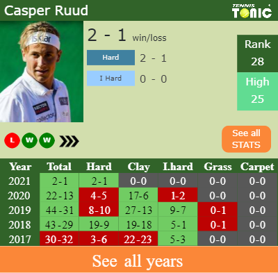 Ruud has a solid record in the last 7 years having won 61% of his matches (216-137). 2-1 on hard in 2021. Talking about his performance on the same surface of this tournament, Ruud has a 43-37 match record in the last 7 years on hard.