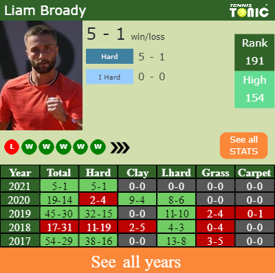 Broady has a good record in the last 10 years having won 58% of his matches (332-237). 5-1 on hard in 2021. Talking about his performance on the same surface of this competition, Broady has a 197-113 record in the last years on hard.