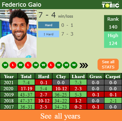 Gaio has a winning match record in the last 10 years having won 56% of his matches (353-272). 7-3 on indoor hard courts in 2021. Regarding his performance on the same surface of this tournament, Gaio has a 33-37 win-loss record in the last years on indoor hard courts.