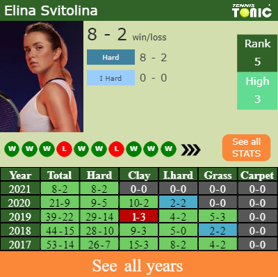 Svitolina has a solid win-loss record in the last 10 years having won 67% of her matches (363-181). 8-2 on hard in 2021. Regarding her performance on the same surface of this event, Svitolina has a 218-99 match record in the last years on hard.