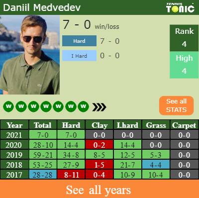 Daniil has a 7-0 win-loss record in 2021, 7-0 on hard (See FULL STATS).