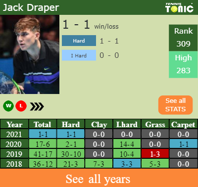 Draper has a 1-1 win-loss record in 2021, 1-1 on hard (See FULL STATS).