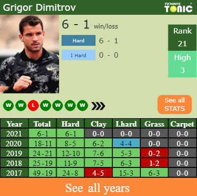 Grigor has a 6-1 win-loss record in 2021, 6-1 on hard (See FULL STATS).