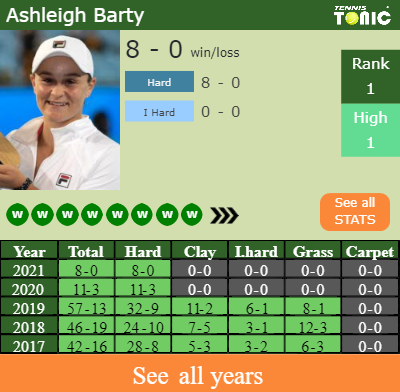 Barty has a 8-0 win-loss record in 2021, 8-0 on hard (See FULL STATS).