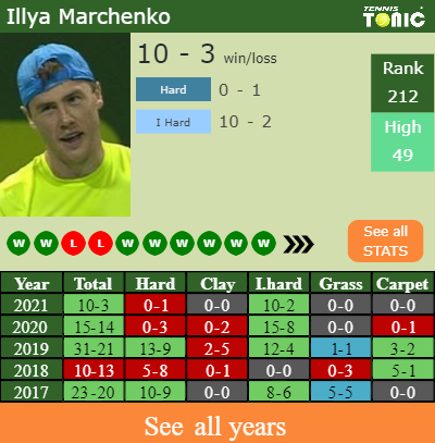 Illya has a 10-3 win-loss record in 2021, 10-2 on indoor hard courts (See FULL STATS).