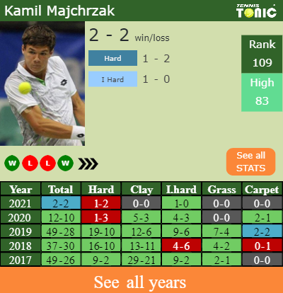 Majchrzak has a 2-2 win-loss record in 2021, 1-0 on indoor hard courts (See FULL STATS).