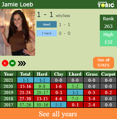 Loeb has a winning win-loss record in the last 8 years having won 56% of her matches (207-162). 1-1 on hard in 2021. Regarding her performance on the same surface of this tournament, Loeb has a 138-98 win-loss record in the last 8 years on hard.