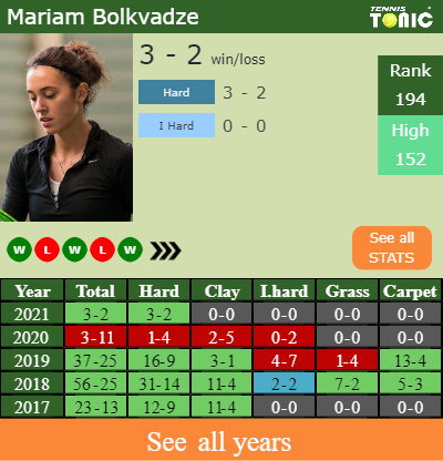 Bolkvadze has a solid record in the last 7 years having won 64% of her matches (186-105). 3-2 on hard in 2021. Regarding her performance on the same surface of this event, Bolkvadze has a 100-55 match record in the last 7 years on hard.