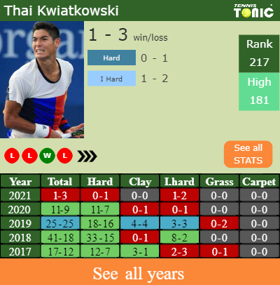 Kwiatkowski has a 1-3 win-loss record in 2021, 0-1 on hard (See FULL STATS).