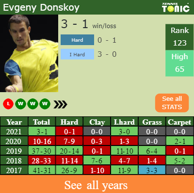 Evgeny has a 3-1 win-loss record in 2021, 3-0 on indoor hard courts (See FULL STATS).