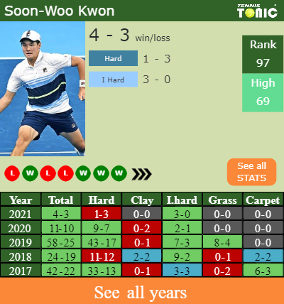 Kwon has a solid match record in the last 8 years having won 63% of his matches (210-123). 3-0 on indoor hard courts in 2021. Regarding his performance on the same surface of this event, Kwon has a 25-11 win-loss record in the last 8 years on indoor hard courts.