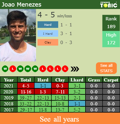 The Brazilian has a 4-5 win-loss record in 2021, 0-3 on clay (See FULL STATS).