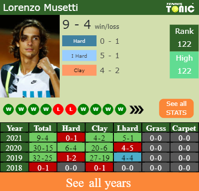 Lorenzo has a 9-4 win-loss record in 2021, 5-1 on indoor hard courts (See FULL STATS).