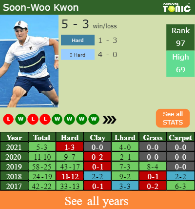Kwon has a solid win-loss record in the last 8 years having won 63% of his matches (211-123). 4-0 on indoor hard courts in 2021. In connection with his performance on the same surface of this competition, Kwon has a 26-11 record in the last 8 years on indoor hard courts.