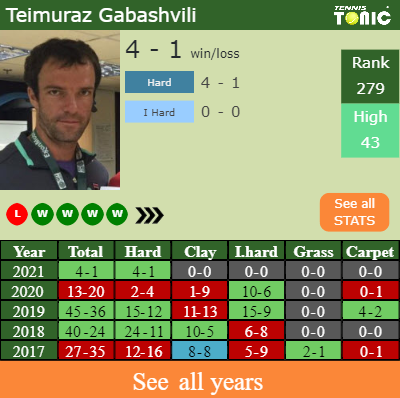 Gabashvili has a good record in the last 10 years having won 54% of his matches (312-265). 4-1 on hard in 2021. Regarding his performance on the same surface of this event, Gabashvili has a 118-90 win-loss record in the last years on hard.