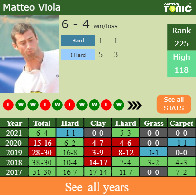 Viola has a winning record in the last 10 years having won 53% of his matches (310-270). 1-1 on hard in 2021. In connection with his performance on the same surface of this event, Viola has a 100-61 match record in the last years on hard.