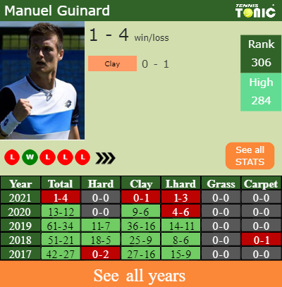 Guinard has a 1-4 win-loss record in 2021, 0-1 on clay (See FULL STATS).