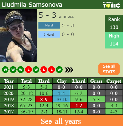Samsonova has a 5-3 win-loss record in 2021, 5-3 on hard (See FULL STATS).
